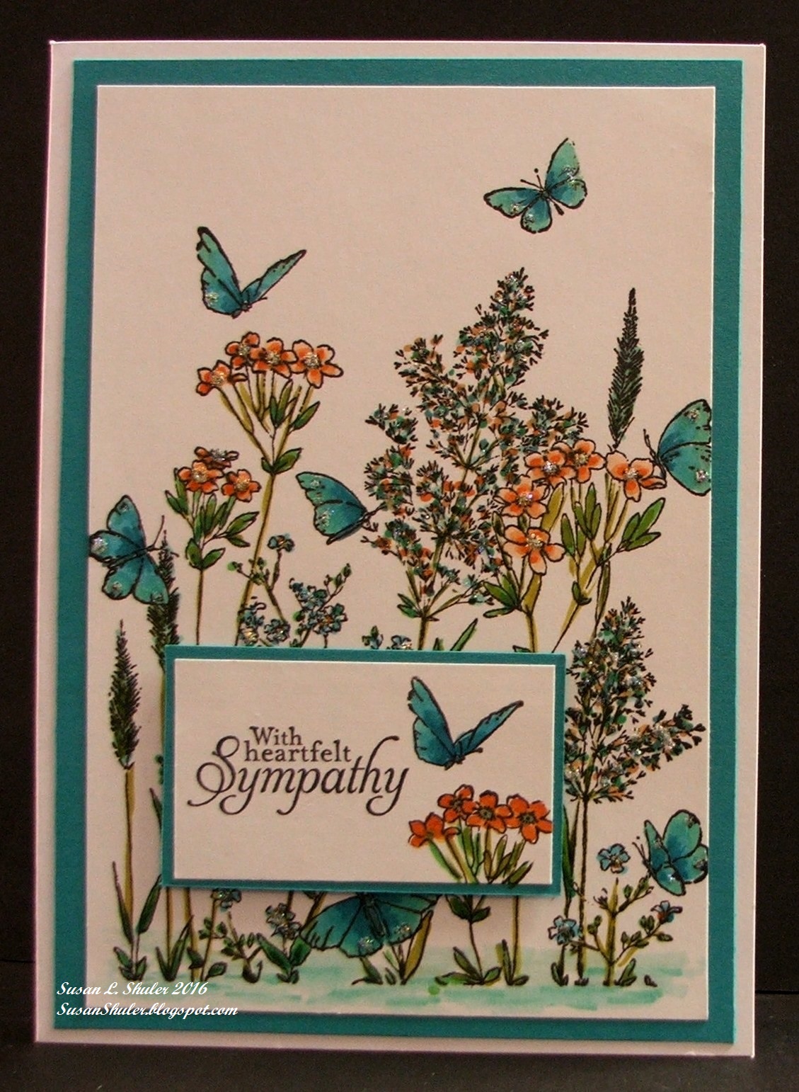 The main image is matted on Bermuda Bay cardstock then on the white card A7 card base. The sentiment is from the Stampin' Up! set "Simply Sketched" and is also stamped with a small portion of the large butterfly garden stamp. It is also colored with Copics and matted on Bermuda Bay cardstock. This is placed to match were it fits in the large picture of the garden stamp and popped up with dimensionals.